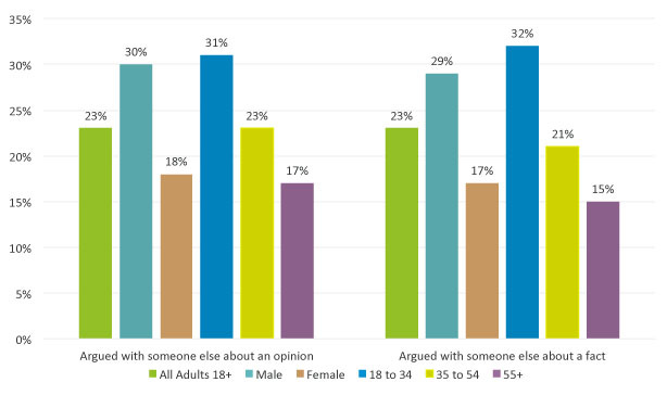 The provocateurs are also entrenched in social media, hoping to create dissension and start arguments with others. According to YouGovAmerica (and this was almost ten years ago so I’m sure it is worse), their research found this trend, validating the fact that internet “trolls” do exist. The chart shows the percentage of on-line users by gender and age group that either argued with someone else about an opinion or argued with someone else about a fact: