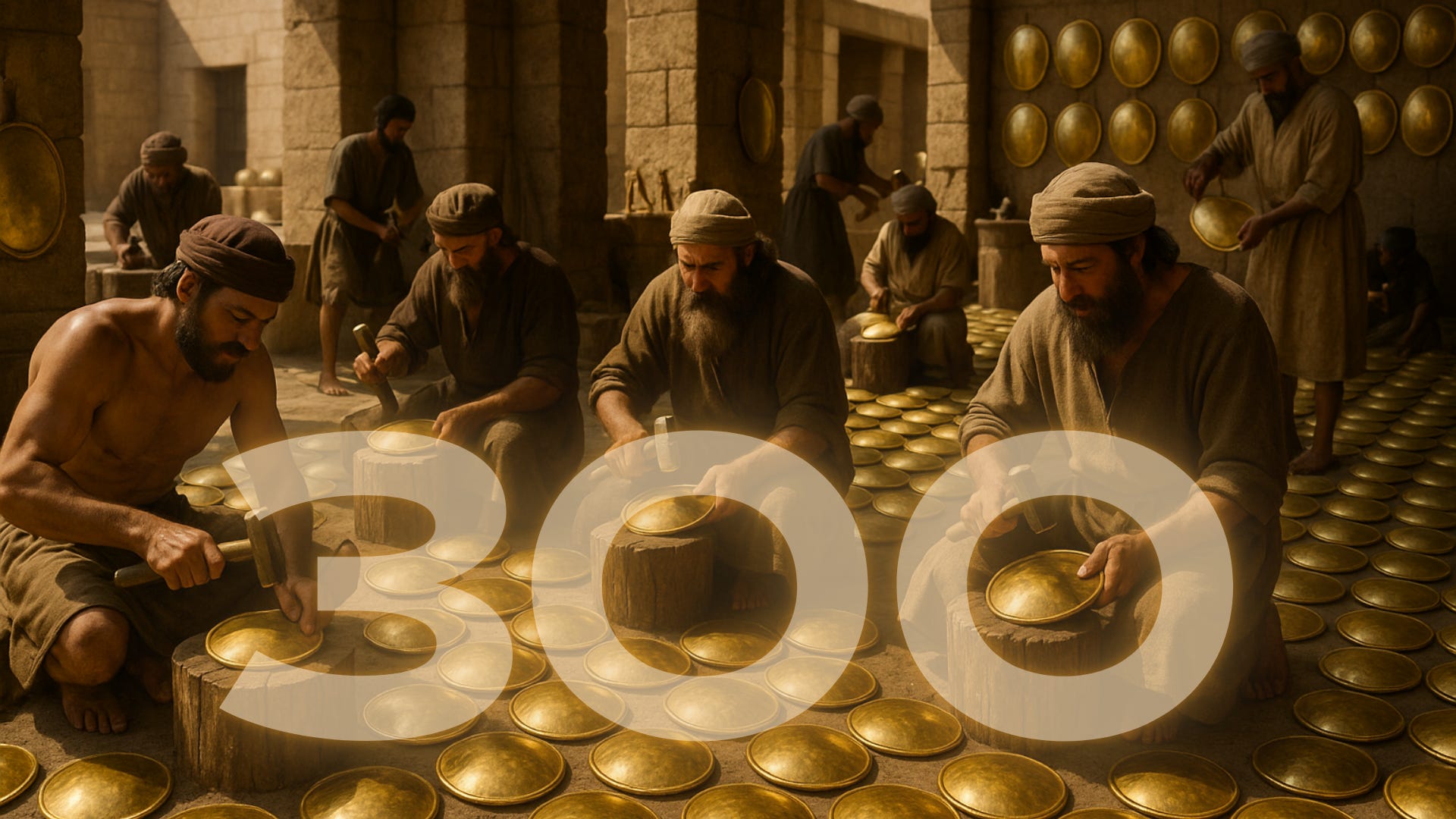 Starting in Genesis, we hear that Enoch “walked faithfully with God 300 years and had other sons and daughters” after he fathered Methuselah at age 52. (Genesis 5:22). In 2 Chronicles 9:16 and repeated in 1 Kings 10:17, we learn that King Solomon “made three hundred small shields of hammered gold, with three hundred shekels of gold in each shield” (see the image at the top of this post).