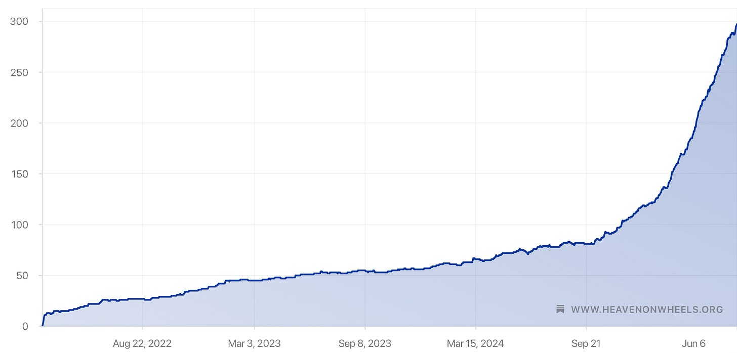300 isn’t a huge number of readers, but take a look at this chart that shows how Heaven On Wheels has grown since we began writing in 2022: