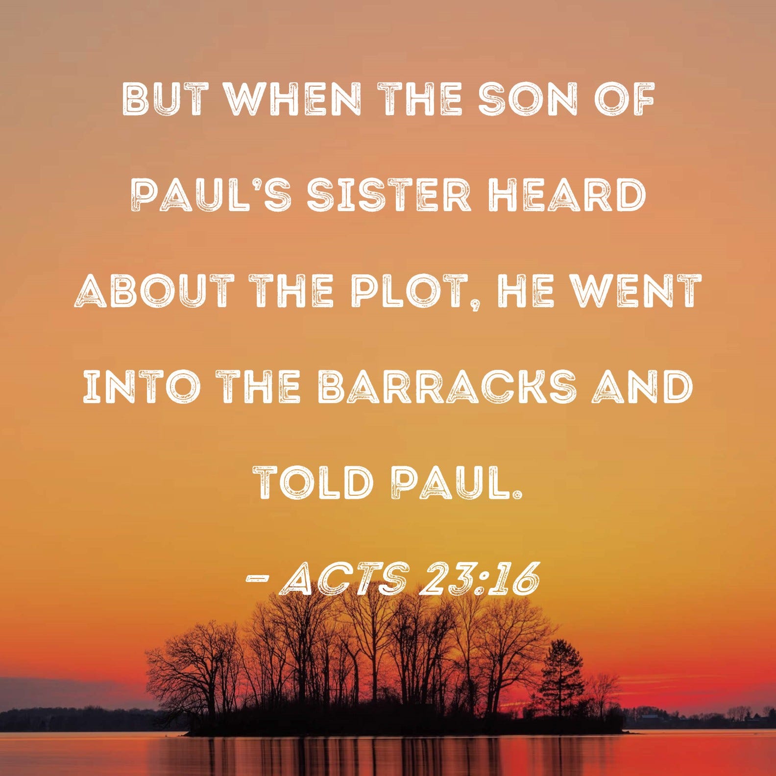 But the son of Paul’s sister heard of their ambush, and he came and entered the barracks and told Paul. Paul called one of the centurions to him and said, “Lead this young man to the commander, for he has something to report to him.” So he took him and led him to the commander and *said, “Paul the prisoner called me to him and asked me to lead this young man to you since he has something to tell you.” The commander took him by the hand and stepping aside, began to inquire of him privately, “What is it that you have to report to me?” And he said, “The Jews have agreed to ask you to bring Paul down tomorrow to the Council, as though they were going to inquire somewhat more thoroughly about him. So do not listen to them, for more than forty of them are lying in wait for him who have bound themselves under a curse not to eat or drink until they slay him; and now they are ready and waiting for the promise from you.” So the commander let the young man go, instructing him, “Tell no one that you have notified me of these things.””