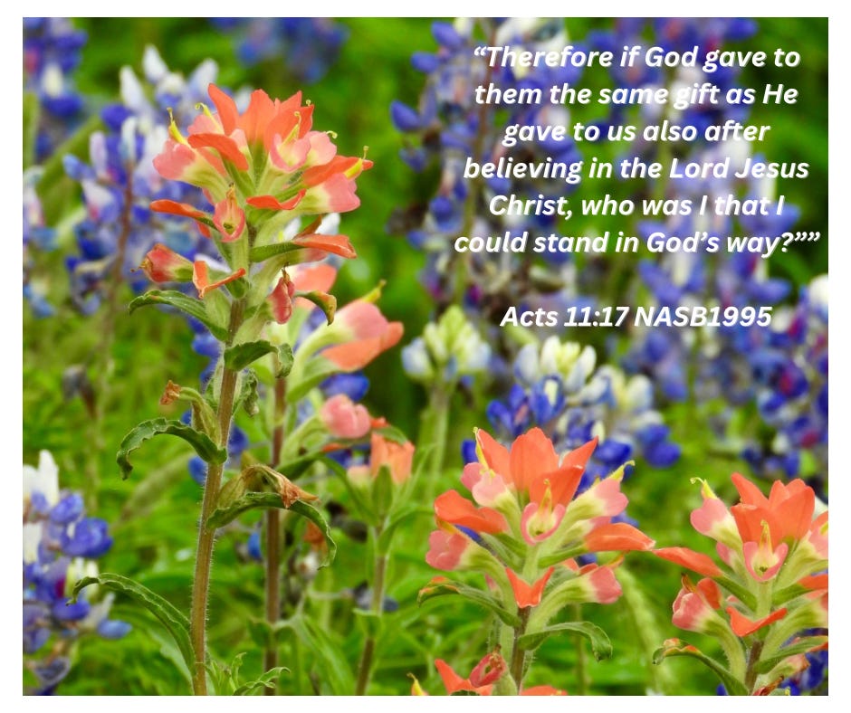 Prayer: Dear Lord - The circumstances in Acts 10 and 11 point to Your infinite love and grace and Your desire to have all come to You in repentance to be saved and granted eternal life. How can we ever thank You enough? Amen.