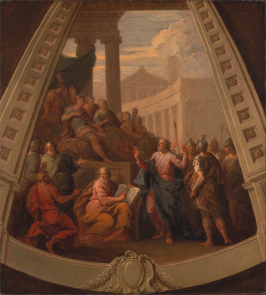 “While Paul was saying this in his defense, Festus *said in a loud voice, “Paul, you are out of your mind! Your great learning is driving you mad.” But Paul *said, “I am not out of my mind, most excellent Festus, but I utter words of sober truth. For the king knows about these matters, and I speak to him also with confidence, since I am persuaded that none of these things escape his notice; for this has not been done in a corner. King Agrippa, do you believe the Prophets? I know that you do.” Agrippa replied to Paul, “In a short time you will persuade me to become a Christian.” And Paul said, “I would wish to God, that whether in a short or long time, not only you, but also all who hear me this day, might become such as I am, except for these chains.” The king stood up and the governor and Bernice, and those who were sitting with them, and when they had gone aside, they began talking to one another, saying, “This man is not doing anything worthy of death or imprisonment.” And Agrippa said to Festus, “This man might have been set free if he had not appealed to Caesar.””