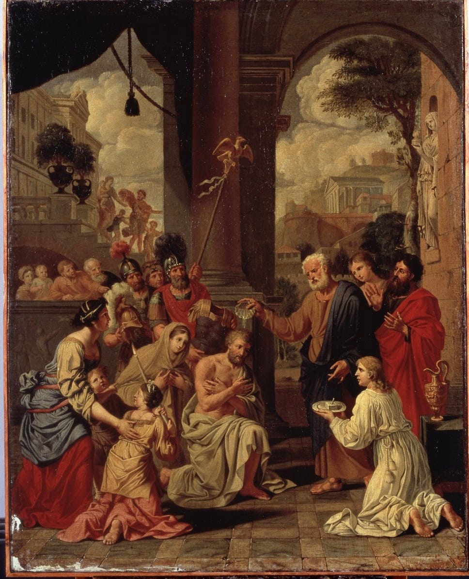 This painting is by Michel des Gobelins Corneille and is from the late 16th century. It rather inaccurately shows Peter pouring a little bit of water over Cornelius, probably reflecting the Reformation ideas of infant baptism rather than immersion.
