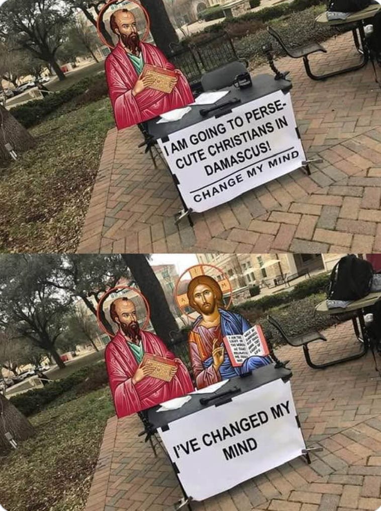I love that Paul’s life was invaded by Christ when he was not seeking Him at all! I was debating sharing a version of this popular meme (the “change my mind” series) that I saw on Facebook a few days ago. I decided to share it with all humility (I think it is a great meme) as a way to visualize what happened to Paul: