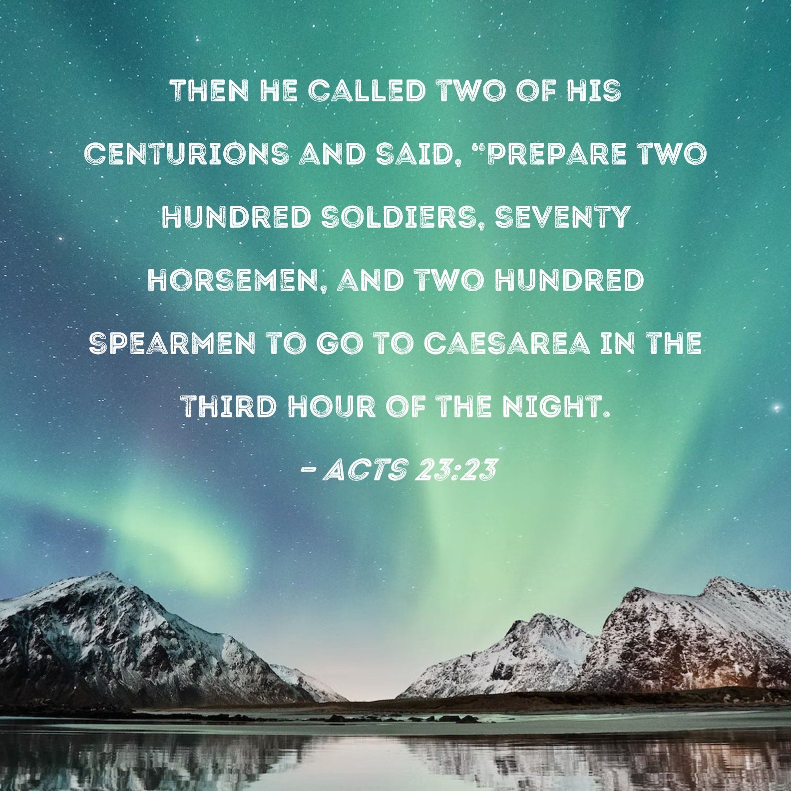 “And he called to him two of the centurions and said, “Get two hundred soldiers ready by the third hour of the night to proceed to Caesarea, with seventy horsemen and two hundred spearmen.” They were also to provide mounts to put Paul on and bring him safely to Felix the governor.
