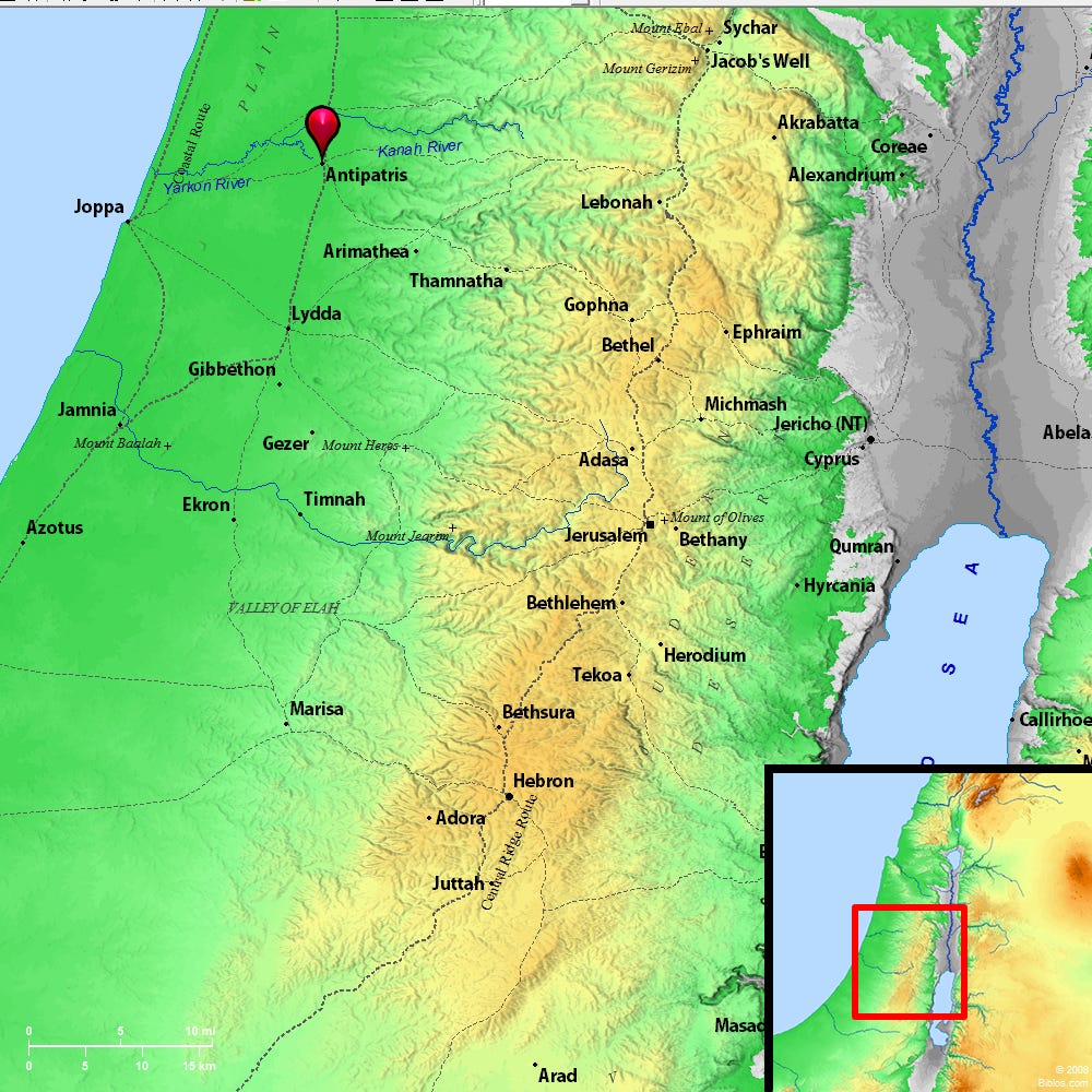 The group traveled in the night to Antipatris (see map above). A group of amateurs vowing to murder Paul would be no threat against these trained soldiers. At Antipatris, the border with Samaria, the 400 foot soldiers left and returned to the barracks while the mounted soldiers continued to Caesarea with Paul. The threat was less in this flat region filled with Gentiles so there was no need to keep the large protective force intact.