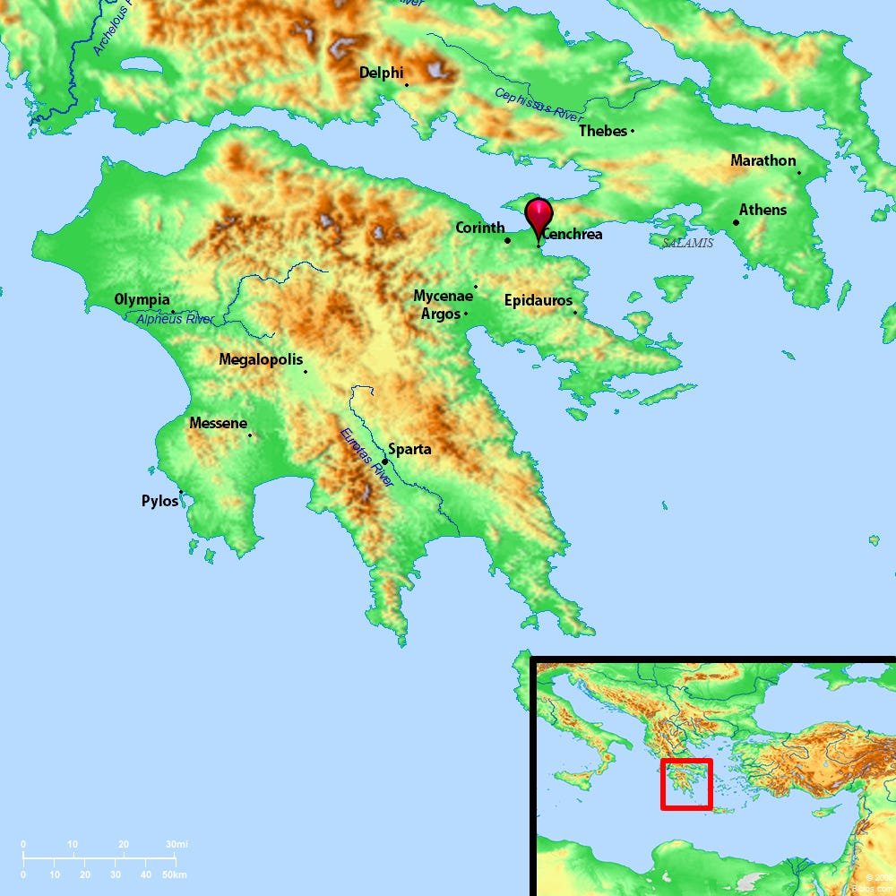 Paul finally leaves Corinth and brings Priscilla and Aquila with him; he is intending to head home to the church at Antioch. Before he boards a ship at Cenchrea, he has his hair cut, for he was keeping a vow. First, where is Cenchrea? Here’s a map from Bibleastlas.org showing this port located just east of Corinth: