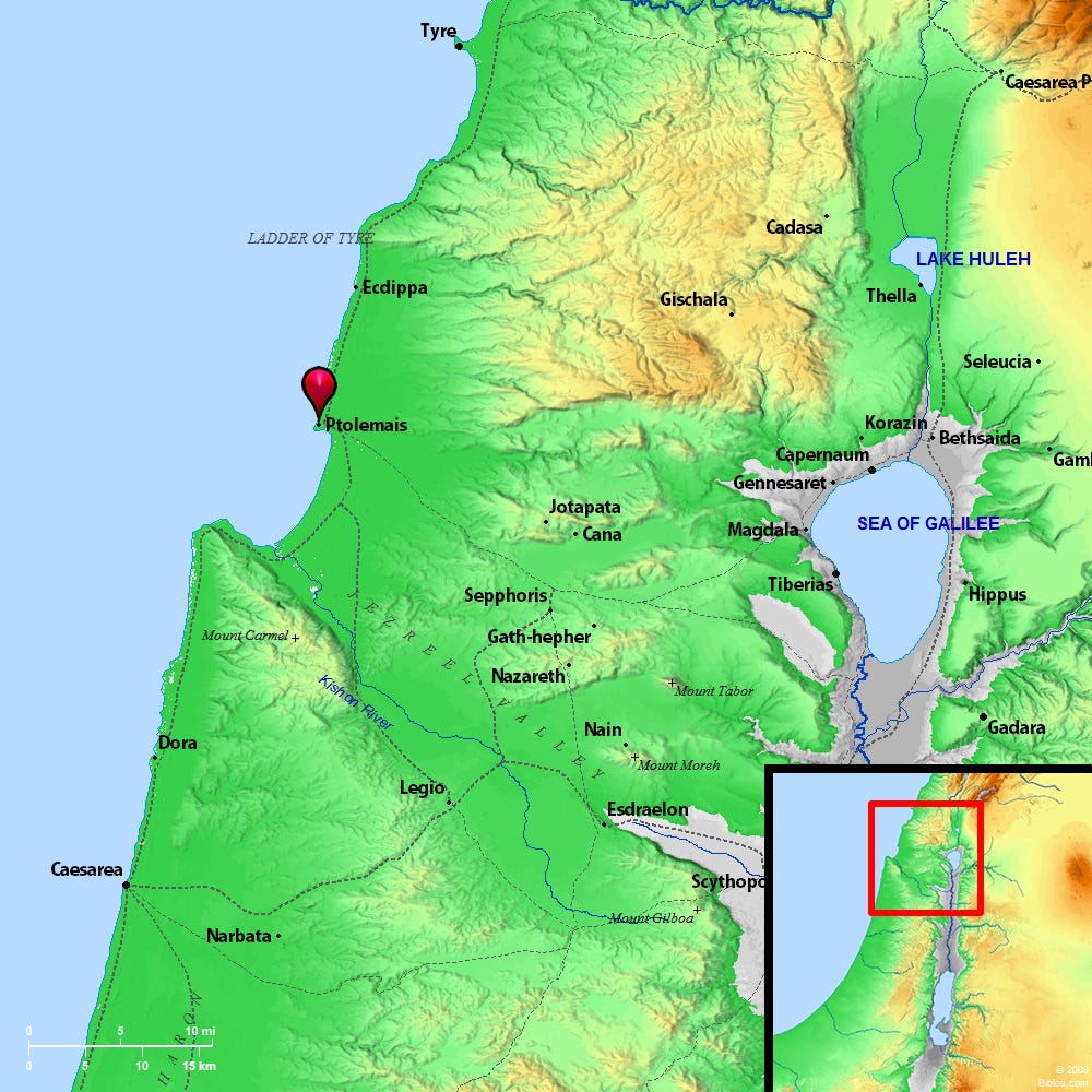 The third missionary journey is nearing the end. The group finishes the voyage from Tyre and arrive in Ptolemais. They spend a day there with the brethren. The next day they arrived in Caesarea. This map below from Bibleatlas.org shows all three locations (Tyre, Ptolemais, Caesarea) along the coast of what would be present-day Lebanon and Israel.