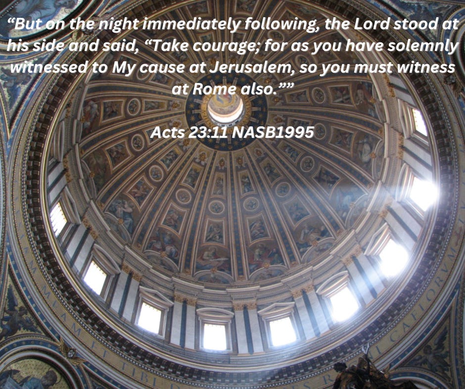 Prayer: Dear Lord - I learned so much from this passage: First, on having a conscience that is a window to Your precepts; second, on seeing that even a great spiritual leader like Paul stumbles in difficult situations; and, third, knowing that in the darkness times in a believer’s life You stand with them and tell them to be of “good cheer”. Thank you, Lord! Amen!