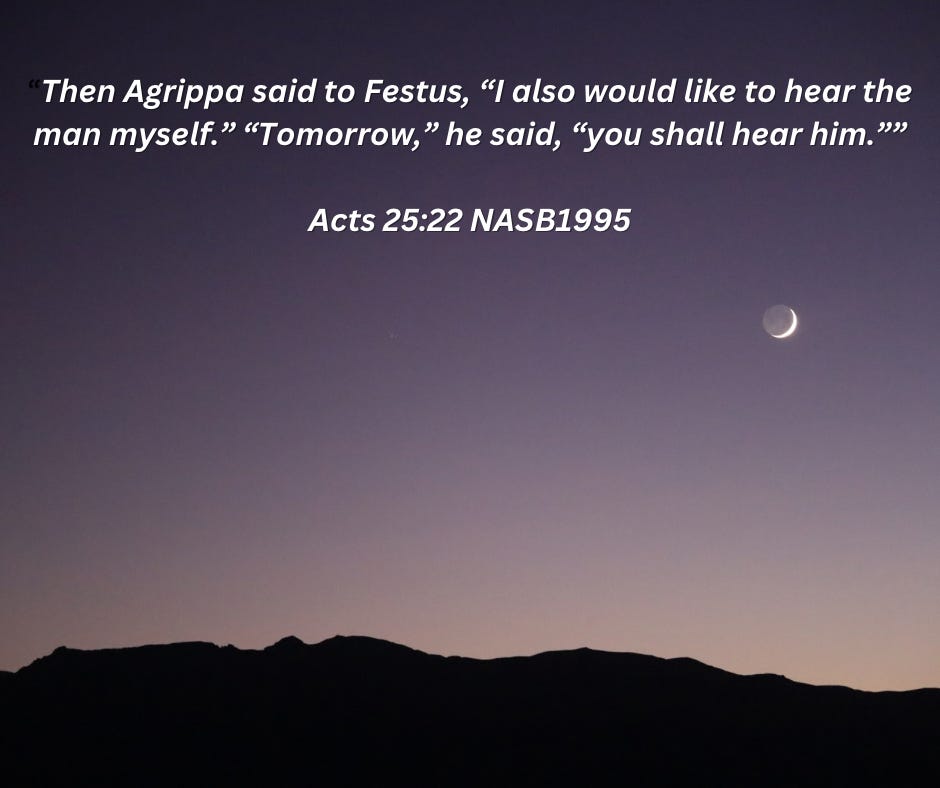 Acts 25 Summary: Festus replaces Felix. He immediately looks into the charges against Paul by traveling to Jerusalem. Another plot is underway to kill Paul if he returns to Jerusalem. Paul makes his case in front of Felix and appeals to his rights as a Roman to bring his case before Caesar. King Agrippa visits and wants to hear what Paul has to say.