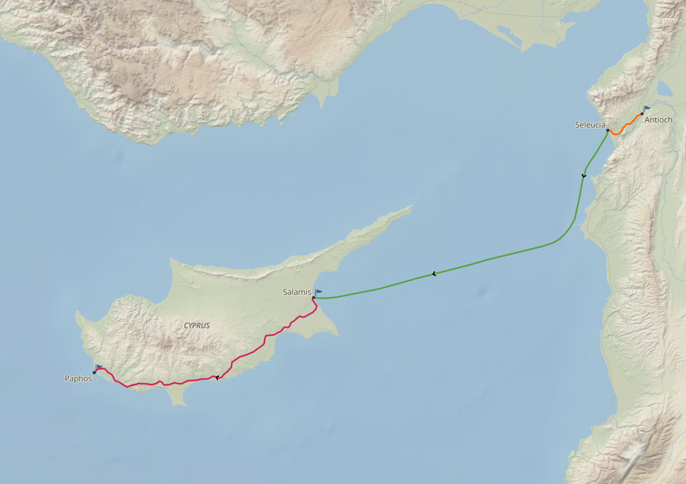 Being sent by the Holy Spirit, the group sailed to Cyprus to preach in the synagogues of the Jews first. So where did they go on this first leg of the first missionary journey? This map, from Precept Austin, shows the route: