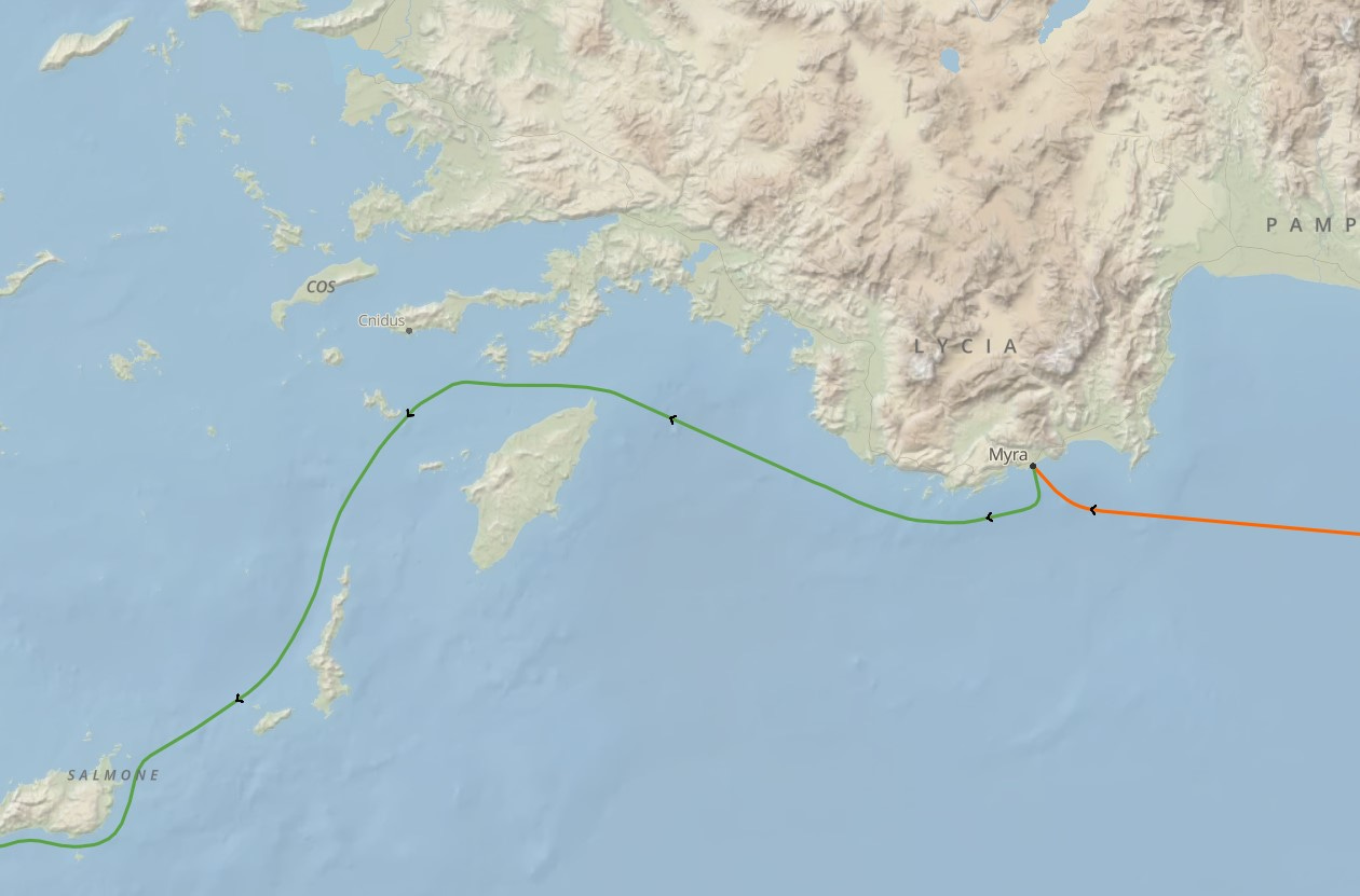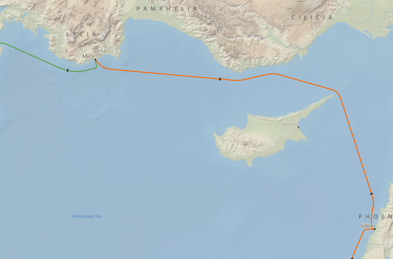 After leaving Sidon, the ship crew chart a course on the sheltered (north) side of Cyprus, the island you can see on the map above. Apparently, there were more pirates in this area, but the presence of a Centurion and his troops would dissuade attacks. The group goes ashore in Myra and the Centurion finds an Alexandrian ship that is bound for Italy.