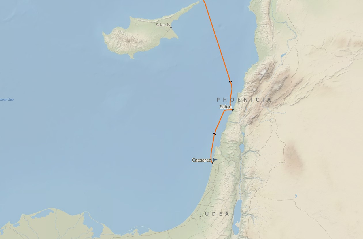 When they arrive in Sidon, Julius treated Paul with consideration and allowed him to go see his friends and receive care. As the centurion in charge of Paul and other prisoners, this already shows the extraordinary trust that Julius had in Paul, because he could be imprisoned or worse for allowing a prisoner to leave his sight. Paul’s care likely consisted of prayers and provisions from the Christians in Sidon.