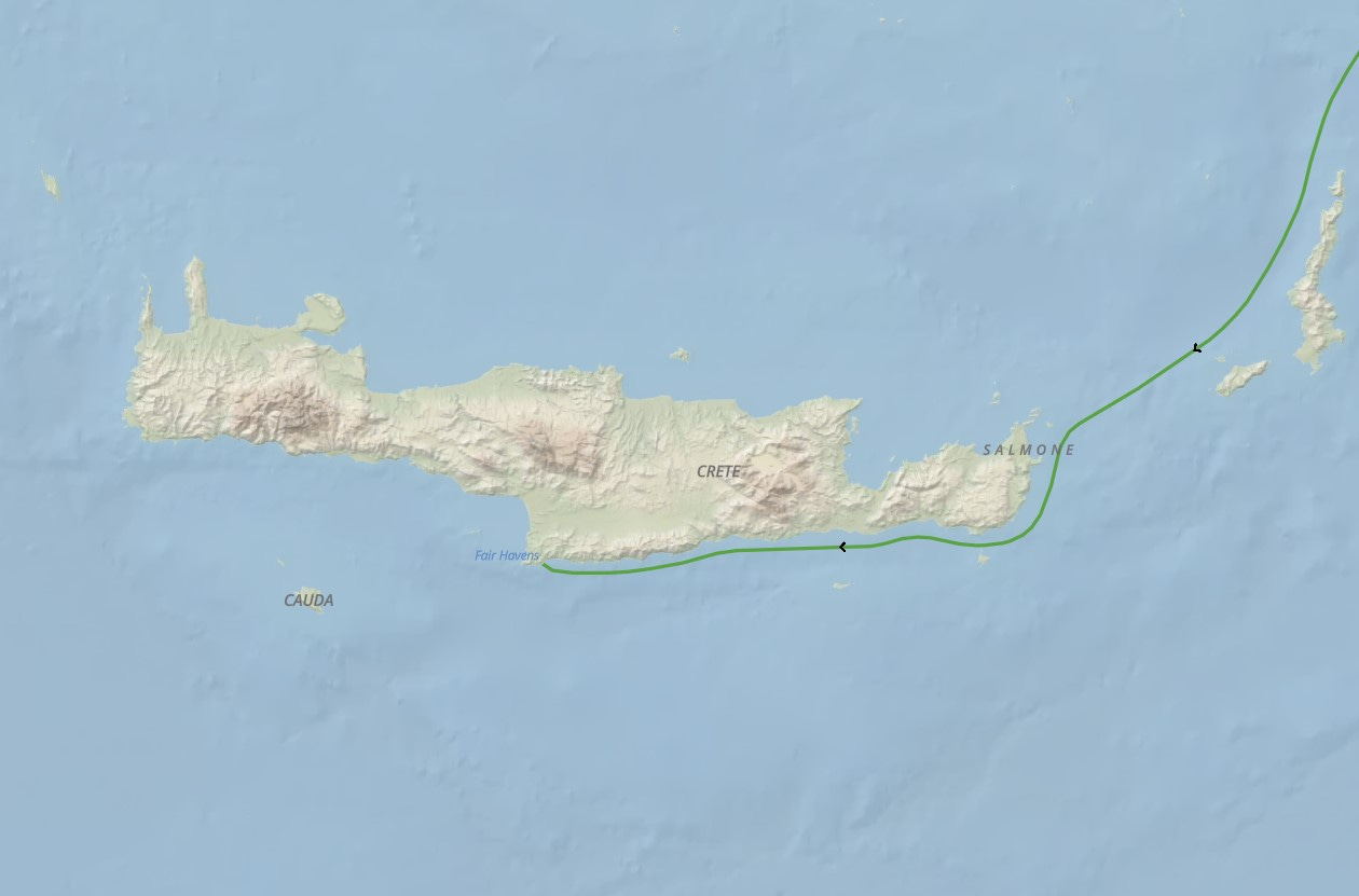 The course of the Alexandrian ship from Myra to Salmone, the east coast of Crete. Map from Precept Austin