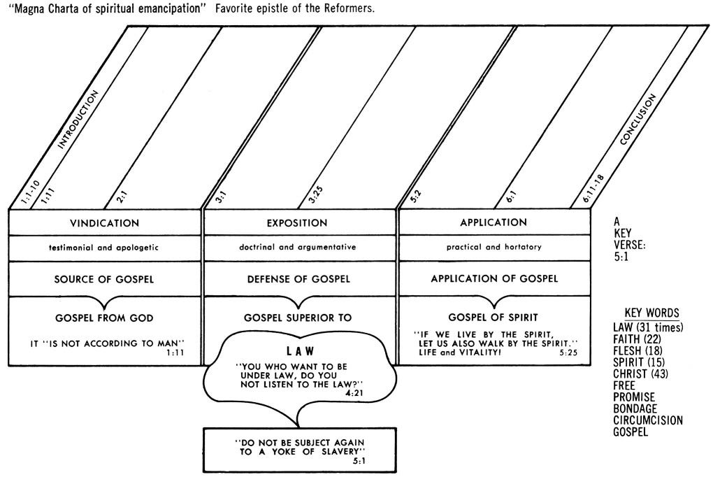 I also found this great chart overview of Galatians on Precept Austin, which is from Jensen’s Survey of the NT. This shows that Galatians is written to show that the Gospel is from God, is superior to the law, and is applied through the Holy Spirit: