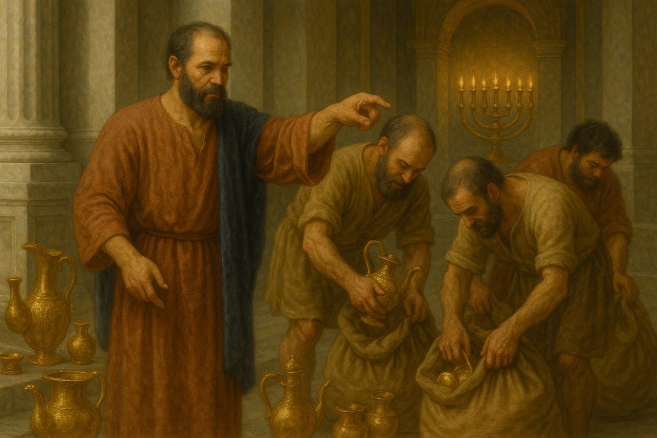 The AI image at the top shows Heliodorus directing the confiscation of items in the temple. Precept Austin recommends reading 2 Maccabees (in the Apocrypha) that tells an amazing supernatural story of Heliodorus. This excerpt is from Bible Hub and is in the New American Bible Revised Edition translation: