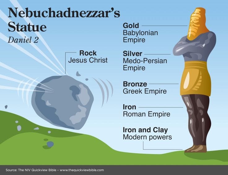 4) Stone that struck the statue became a great mountain (Da 2:35, Mountain = Kingdom in Da 2:44, cp Rev 17:9,10, Isa 2:2)