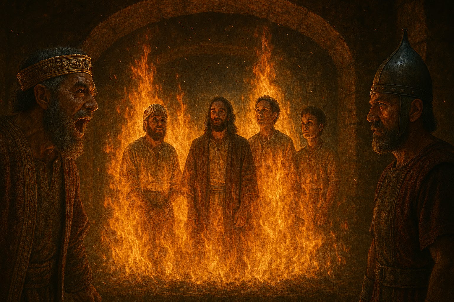 “Then Nebuchadnezzar was filled with wrath, and his facial expression was altered toward Shadrach, Meshach and Abed-nego. He answered by giving orders to heat the furnace seven times more than it was usually heated. He commanded certain valiant warriors who were in his army to tie up Shadrach, Meshach and Abed-nego in order to cast them into the furnace of blazing fire. Then these men were tied up in their trousers, their coats, their caps and their other clothes, and were cast into the midst of the furnace of blazing fire. For this reason, because the king’s command was urgent and the furnace had been made extremely hot, the flame of the fire slew those men who carried up Shadrach, Meshach and Abed-nego. But these three men, Shadrach, Meshach and Abed-nego, fell into the midst of the furnace of blazing fire still tied up.