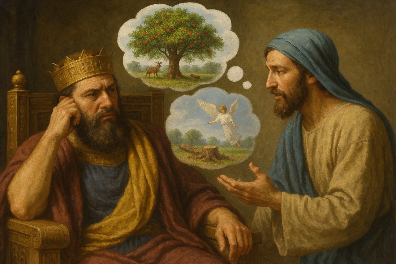 The second part of the dream describes how an angelic being descends and requires that the tree be chopped down, leaving a stump with an iron band. Daniel tells the king that he will be driven away from his kingdom for a period of time and will engage in behaviors like an animal, grazing in the grass. I wonder if the king thought this was a metaphor for something, not realizing that it would be fulfilled exactly as described in the near future.