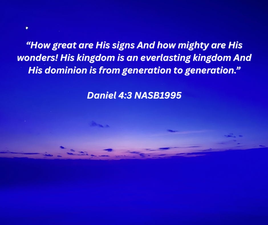 “May your peace abound! It has seemed good to me to declare the signs and wonders which the Most High God has done for me. How great are His signs And how mighty are His wonders! His kingdom is an everlasting kingdom And His dominion is from generation to generation.”