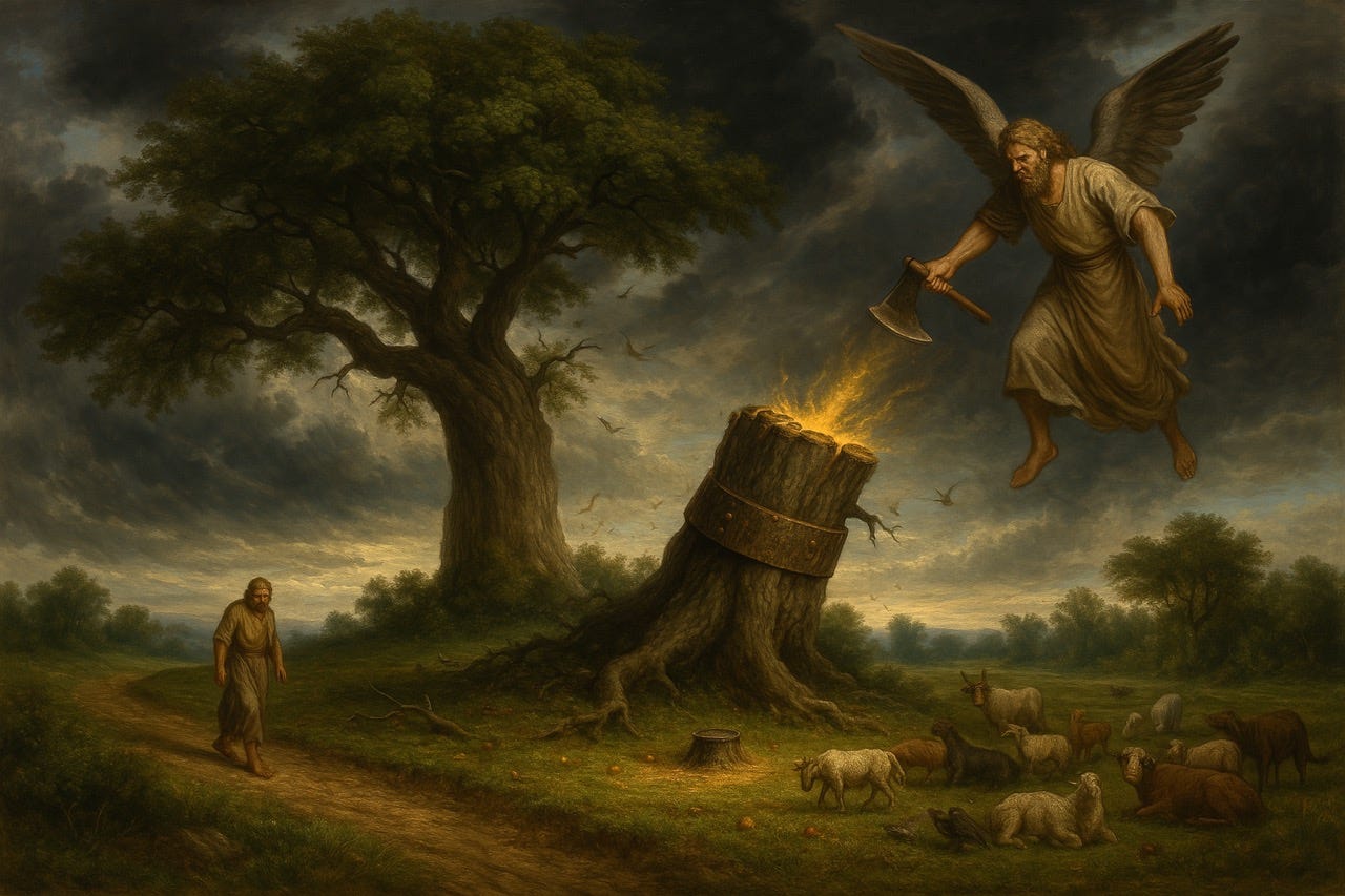 The dream has two parts: First, there is a vision of a beautiful tree that was large and strong and fruitful (see the image at the top). The tree provides shelter for many animals and birds and has abundant fruit. Second, an angelic watcher descends from heaven and orders the tree to be chopped down but the stump will remain with a band of iron and bronze around it (see image just above). The animals and birds will flee. The stump, which represents a man, will change and have the mind of an animal, grazing in the grass and drenched with dew. This change will last for seven periods of time. The sentence is pronounced so that the lowliest of men will know that the Most High is ruler over the realm of mankind.