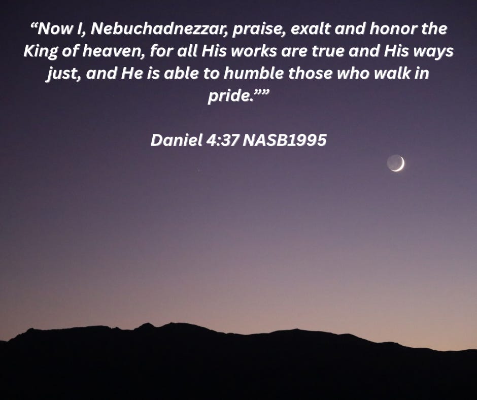 At that time my reason returned to me. And my majesty and splendor were restored to me for the glory of my kingdom, and my counselors and my nobles began seeking me out; so I was reestablished in my sovereignty, and surpassing greatness was added to me. Now I, Nebuchadnezzar, praise, exalt and honor the King of heaven, for all His works are true and His ways just, and He is able to humble those who walk in pride.””