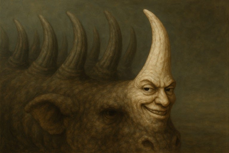 Well, I guess I should have thought about this when I decided to tackle the book of Daniel. I am beyond puzzled by eschatology (end times) prophecy in the Bible. I read commentary after commentary about this last part of Daniel 7 and am still scratching my head (so are many of those scholars, because they use a lot of conditional language - “it might mean this” or “it could be this” - in their attempts to interpret this prophecy). The image above, created by an AI program, is enough to give you nightmares and is meant to represent the “little horn” that is dominant on the fourth beast that has ten horns and iron teeth and nails. That horn takes down three other horns by the roots and has human eyes and is boastful. The little horn actually becomes larger than the other ones that are left. Apparently it represents the Antichrist and is the same as the first beast in Revelation 13, who is given his power by the dragon (Satan):