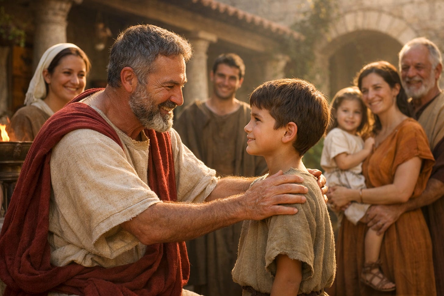 Adoption in the Greco-Roman days was an important process. Powerful men without a male heir could adopt a relative or even a slave and instantly turn that child (or adult) into a beloved son. This theme was explored in the splendid book by General Lew Wallace (a veteran of the Civil War) and the 1959 award-winning film “Ben Hur”. The title character, Judah Ben-Hur, who is working as a galley slave, rescues a wealthy and powerful Roman Consul (Arrius Quintus) when their ship is sunk. He is adopted into the family with all of the rights and privileges. The AI image for today (above) looks at this theme of adoption during those times. Just a reminder: We do not use AI for anything in these devotionals except images.
