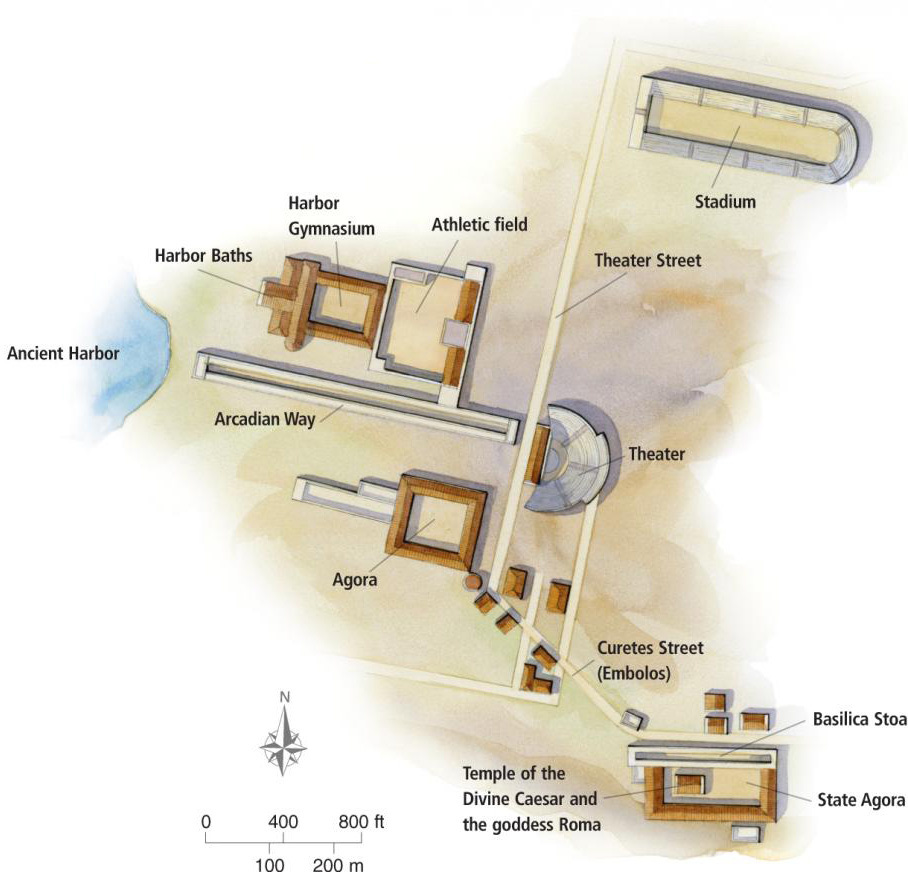 Paul apparently preached in the amphitheater that is in the photo at the bottom right of the gallery (it is apparently used currently). The two-story structure in the photo at the bottom left is the Library of Celsus. Excavations of Ephesus began in 1869 through efforts by the British Museum and many groups are still excavating the site. Nearby, the ruins of the Temple of Artemis can be found (once one of the seven wonders of the ancient world, as noted in the Wikipedia excerpt) and also a church dedicated to St. John the Apostle is in the area. For Catholics that visit the area of Ephesus, there is a site not that far away that has the modest home that Mary supposedly lived in towards the end of her life; it is now a shrine. This map, taken from Precept Austin (source unknown), shows the layout of Ephesus around the time of Paul; note the theater location.