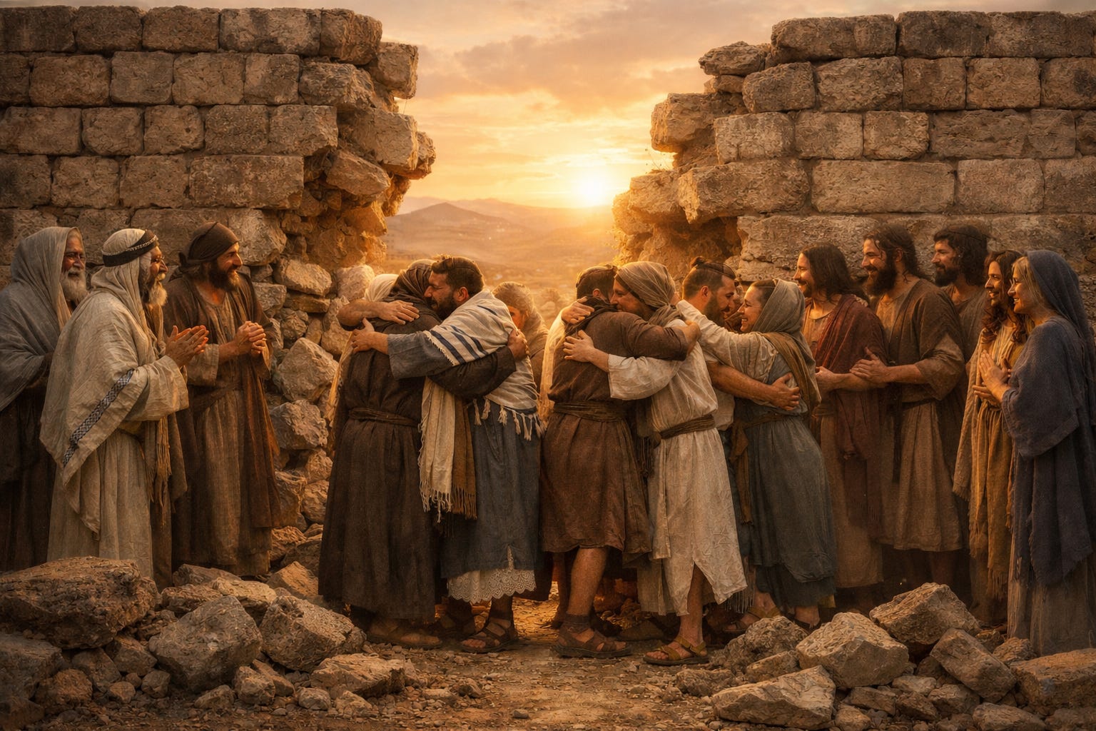 Paul tells the Gentiles at Ephesus to remember that they were separate from Christ, excluded from the commonwealth of Israel and strangers to the covenants of promise. They had no hope and were without God in the world. He also reminds them that they were called unsavory names, like “uncircumcision” (interesting that this usage is a proper noun instead of an adjective like “uncircumcised”). Today’s AI picture shows Christians, both Jewish and Gentile, being reconciled as one in the Lord, with the walls separating them torn down metaphorically.