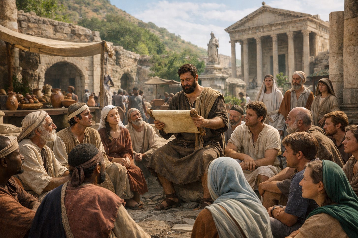 In the AI image that Steve requested, a representative or elder at the church at Ephesus is reading the letter from Paul to a congregation with both Gentiles and Jews in attendance (he is certainly a husky individual!). He is likely telling them about the mystery of Christ. This mystery, specifically, is that Gentiles are fellow heirs and fellow members of the body and fellow partakers of the promise in Christ Jesus through the Gospel.