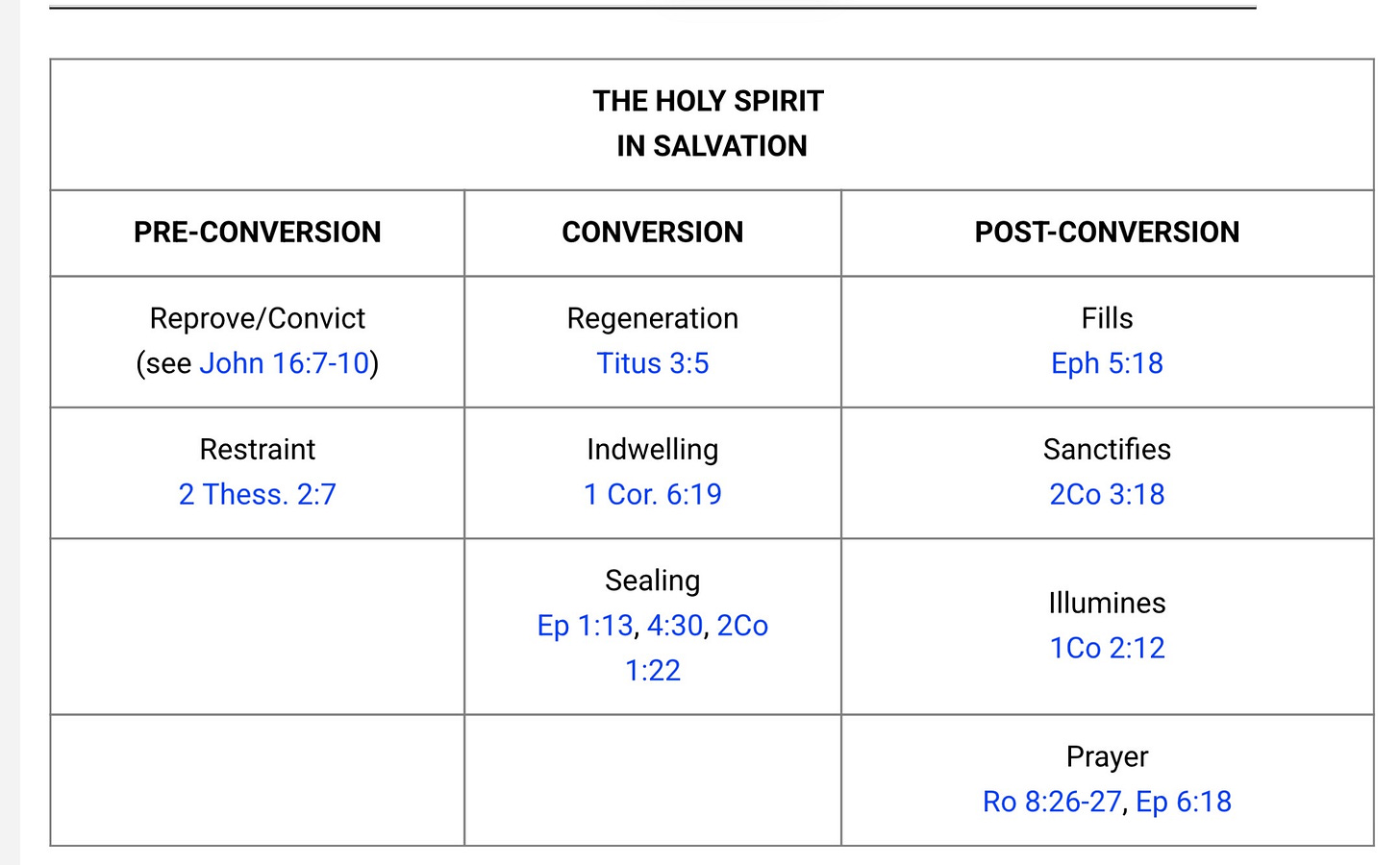 We believe and we are sealed in that promise! Enduring Word has a handy table of how the Holy Spirit works in our salvation, with scripture references: