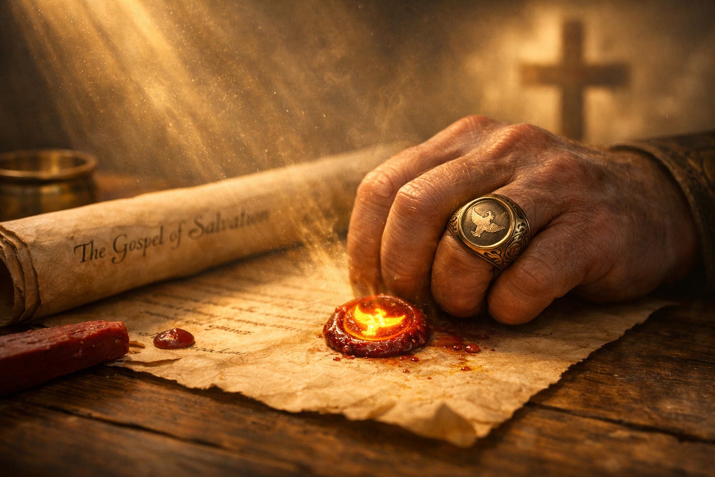 We finally reached a clean verse break in this lengthy passage at the beginning of Ephesians 1. Once again, Steve fed the identified verses to ChatGPT and it produced the AI image at the top. The ring seal apparently represents the Holy Spirit, with the image of the dove. It has been stamped onto the Gospel of Salvation, sealing believers in His promises. There are a number of symbols for the Holy Spirit and Gotquestions.org identifies those symbols:
