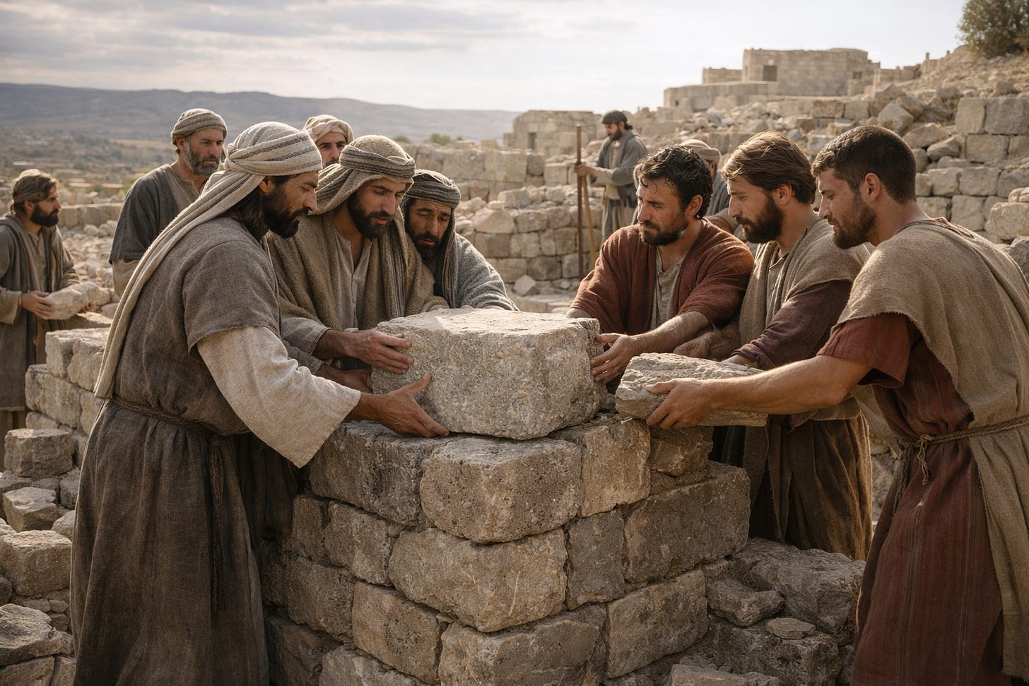 The AI image at the top shows the two groups, Jewish and Gentile believers, laying the stones for that holy temple, the church of the Lord. This commentary from Enduring Word is quite good: