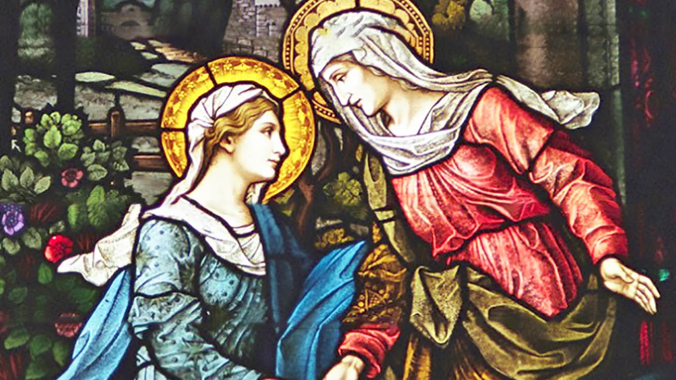 Stained glass window detail of Mary visiting Elizabeth. Source unknown