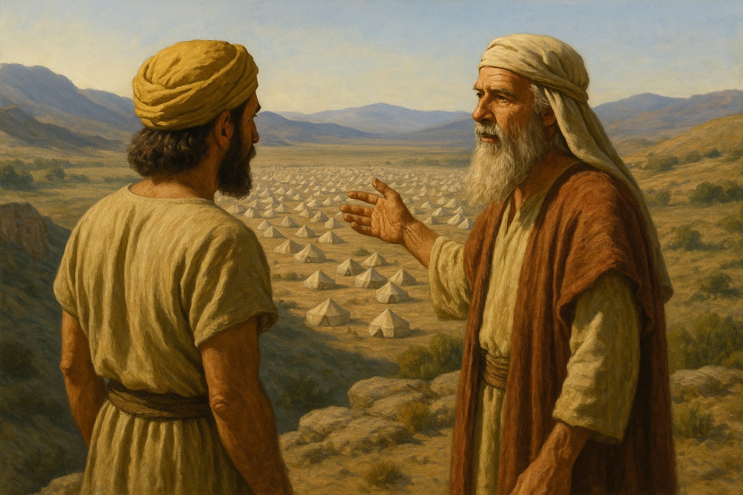 Balaam (right) and Balak upon the heights of Bamoth Baal, overlooking the camp of the Israelites. Image generated by ChatGPT (OpenAI) using the DALL·E model.