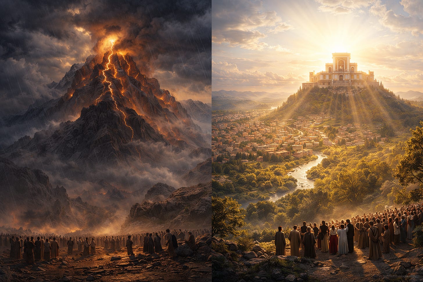 A very interesting comparison is made in this next passage, between Mount Sinai, where the Israelites camped and were in fear of the sights and sounds of God’s presence, and Mount Zion, where the city of the living God beckons to the believers. The AI image that Steve asked for of these two holy mountains contrasts the darkness and gloom of Mt. Sinai on the left with the beauty of Mt. Zion on the right. The experience at Mt. Sinai is documented in Exodus: