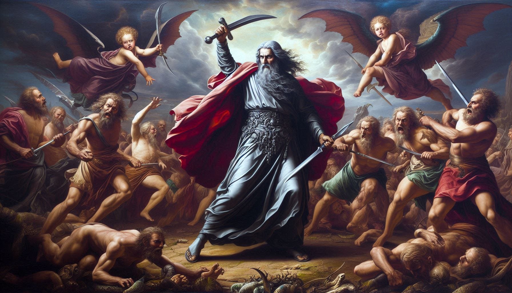 An AI representation of the vengeful Old Testament God slaying the wicked. Created using Dall-E 3.