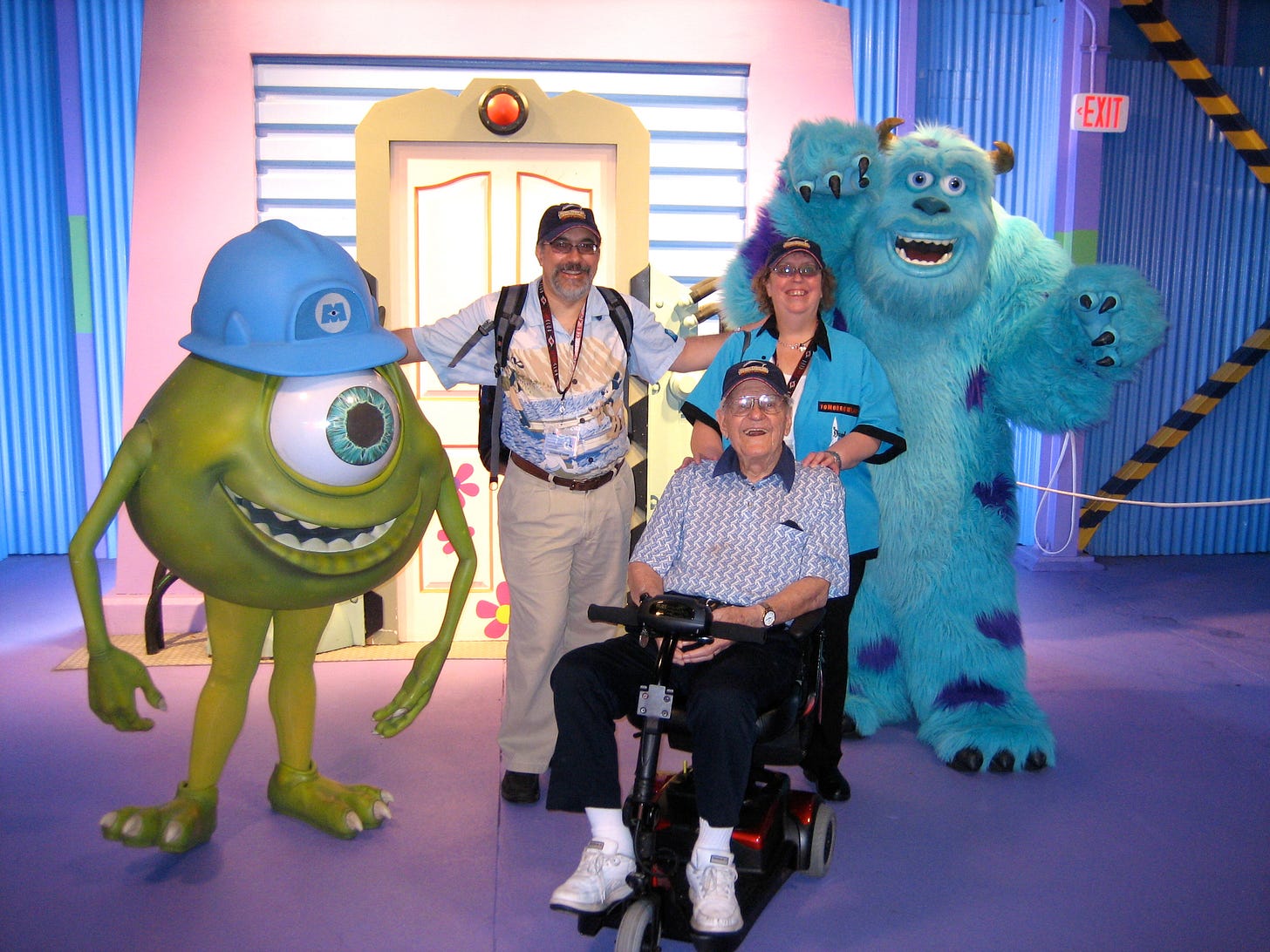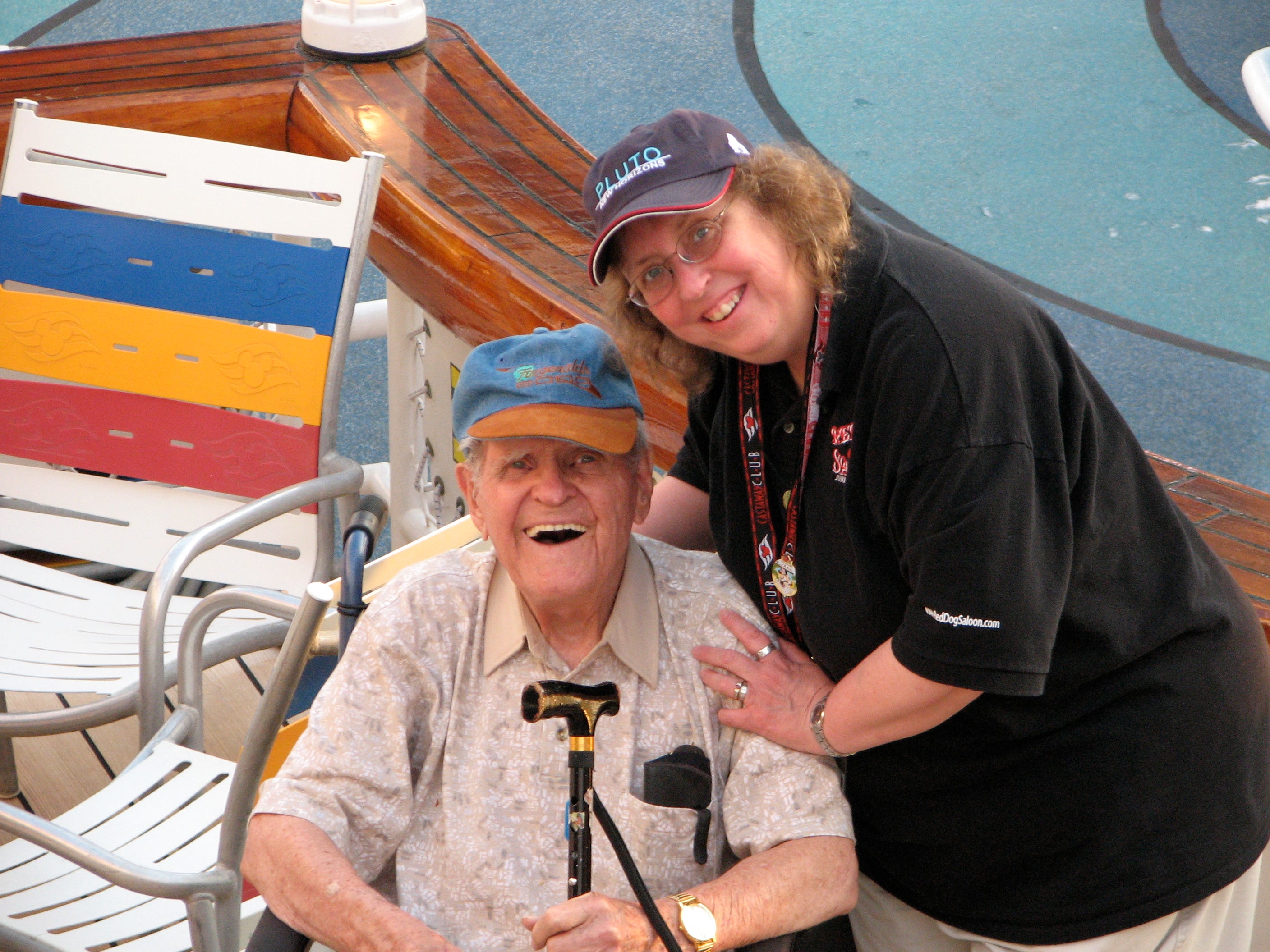 My Dad was mentally sharp and he loved to travel and experience new things. He had some vision problems (macular degeneration), was very deaf (he really hated those hearing aids) and had to use a walker, cane or scooter to get around, but he was eager to go somewhere or anywhere! Steve and I had already booked a 12-day Disney cruise in the Western Mediterranean for June, 2007 before my Mom passed and we raced to get his passport renewed and get him airfare and a stateroom near us on that same trip. He was so thrilled! He had a marvelous time on that cruise and made friends with several children. We did a few other trips with him, including a short trip to Las Vegas, a river cruise from St. Louis to Red Wing (MN), and a Disney World trip with a short Disney Cruise (this was our last trip with him). My Dad and Mom and had saved quite a bit of money for her to live on after he expected to die first, so he paid for some of these trips. We also took him to so many events, including Rockies games, concerts, and other outings. He loved every minute of those events.