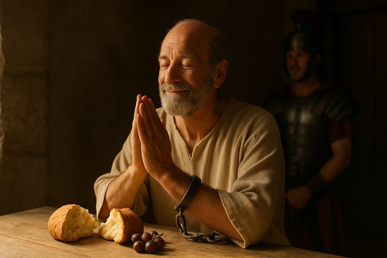 Paul rejoices in the gift he received from the saints at Philippi (Epaphroditus delivered this gift). He knows they have always been concerned but lacked the opportunity to help him. Their gift is an answer to a prayer. He tells them that he doesn’t speak from want, because he has learned to be content in whatever circumstances he finds himself. In the AI image that Steve created at the top, Paul is joyfully praying for the small rations that he has been given in his incarceration.
