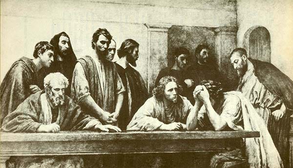 The torment and woe of the disciples is palpable. Peter, the denier, is the figure with his hands on his forehead, with John sitting near him (the only disciple at the crucifixion). Andrew, who brought people to Christ, looms behind his brother. James sits to the left of John, staring into space and trying to make sense of what is senseless. The miracle-working rabbi that they have followed is now dead, after suffering horribly during His trial and crucifixion. There is no hope, but only fear and dread and they are in hiding from the authorities. Of course, if these guys had actually been listening, Jesus told them over and over again that His fate and the salvation of humanity led through the Cross: