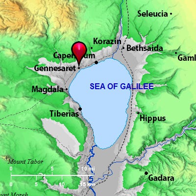 This miracle (rather an unnumbered set of many, many miracles) is briefly documented at the ends of Matthew 14 and Mark 6. Our beloved Lord has just fed the 5,000+, then walked on water, challenging the little faith of the disciples (especially Peter). He barely has time to get out of the boat at Gennesaret (see map from Precept Austin) when He is “recognized” and the crowds converge on Him, bringing the sick from all around the region, many on pallets. People are grasping at His garments and are being healed. Jesus has ultimate power over nature!