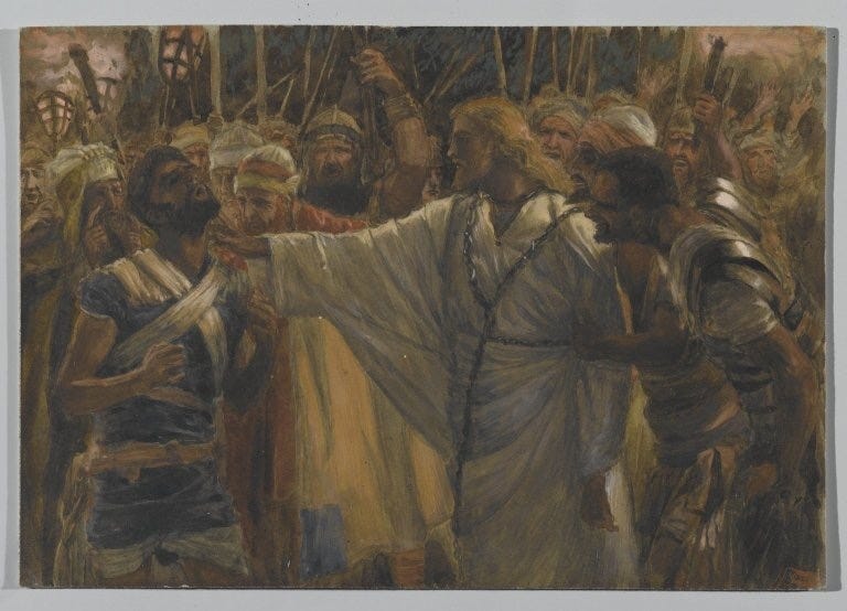 I find it interesting that the fact that this servant or slave is named means that he might have converted later to Christianity. Peter, of course, ends up having a miserable night all together, with his later denials of Jesus. Fortunately, before a real melee could begin, Jesus calms the group down after healing Malchus and goes peacefully with the arresting party and the rest of them scatter. I sometimes can’t belief that this is the same Peter who speaks with such authority in Acts after the Pentecost and wrote two beautiful epistles. I must give kudos to the people who are doing the streaming hit series “The Chosen”: their choice of the actor portraying Peter (Shahar Issac) is perfect. He is rash and impulsive and prone to quick emotional reactions and sudden bouts of anger; this Peter is also younger, which goes against many of the historical analyses that identified Peter as an older man (the Bible does not actually say).