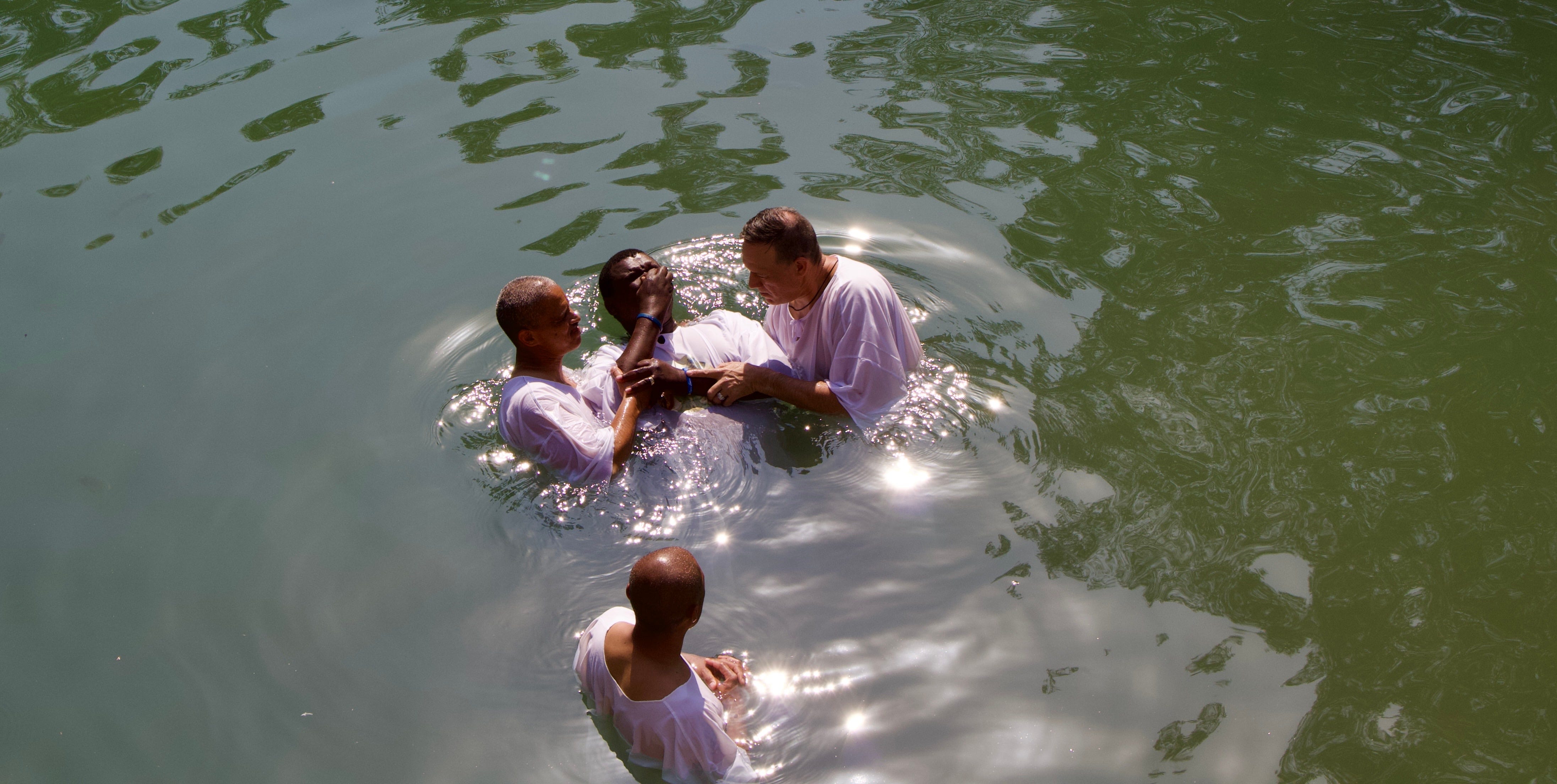 Image of baptism in the Jordan River, Yardenit, Israel © 2018, Steven Sande.