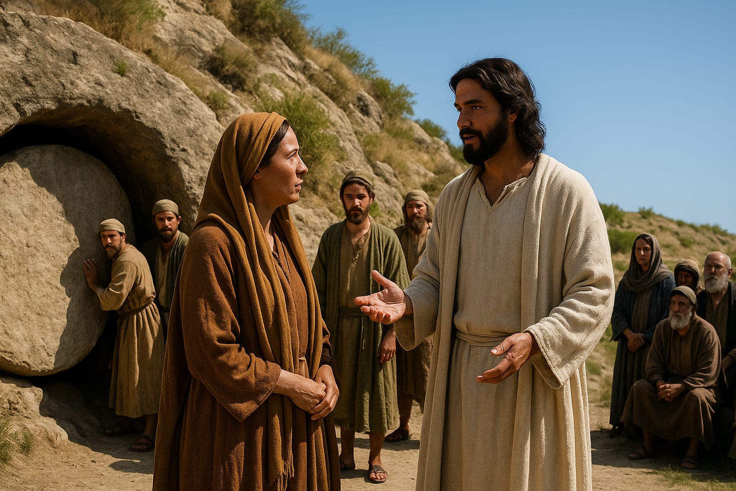 Jesus is talking to Martha, the sister of Lazarus. Those who are familiar with this recounting of the raising of Lazarus from the dead know that act infuriated the Sanhedrin, the Jewish religious elite. At least the Pharisees (a subset of the Sanhedrin) believed in the possibility of resurrection; the Sadducees rejected that idea, so the fact that Lazarus was alive again was enough to set the plot to kill Jesus in motion.